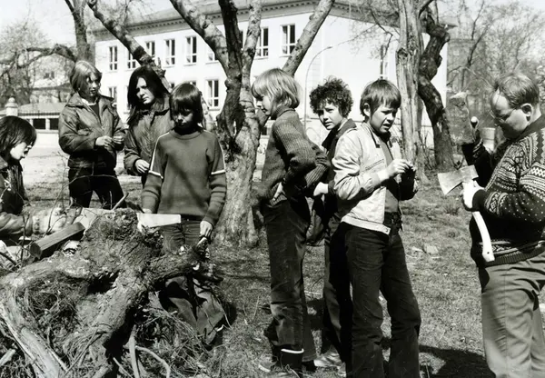 Elever med lærer sager og hugger opp gammelt tre. Fra "Aksjon Spire 1973" på Uranienborg skole på området mellom Harelabbveien, Briskebyveien og Skovveien (lokalnavn "Harelabben" etter planten harelabb). Skolebygning i bakgrunnen.