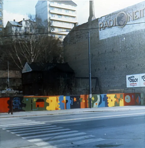 Tøyen Juniorklubbs dekorasjoner / malerier på plankegjerde langs Kjølberggata. Fra "Aksjon Spire 1973". Trehusbebyggelse i Brinken bak. Bebyggelse i Norderhovgata bakerst. Reklamevegg.