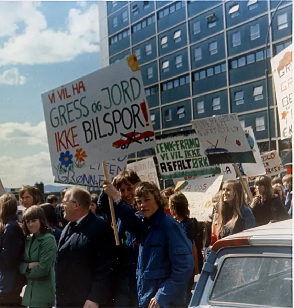 Elever og lærere fra Hersleb og Tøyen skoler i demonstrasjonstog med plakater for "fredning" av Caltexløkka. Fra "Aksjon Spire 1973". Høyblokk på Enerhaugen i bakgrunnen (fra første halvdel av 1960-tallet).