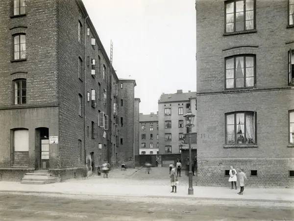 Fra Jens Bjelkes gate. Teglsteinsgårder. Nummer 14 til høyre (gråbeingård), bygningen tilhørende Lakkegata 71 til venstre med David Hansen skomakerverksted på hjørnet. Barn i lek. Gatelykt.