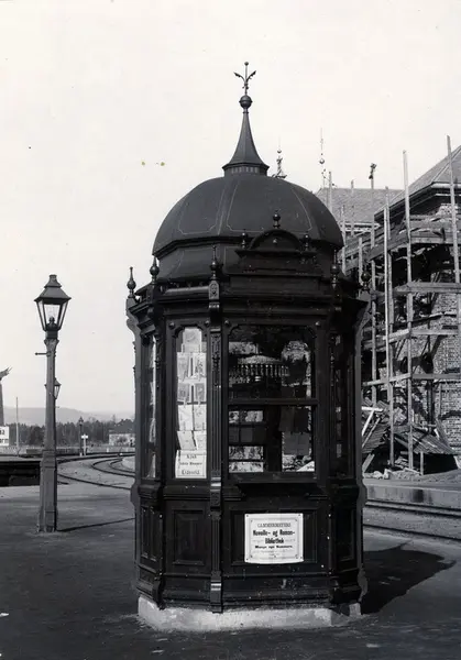 Kioskkompaniets (Narvesens) avrundede blad- og aviskiosk med kuppel og spir. Nyklassisisme. Reklameskilt med teksten: "CAMMERMEYERS Novelle- og RomanBibliothek Mange nye Nummere". Gatelykt.