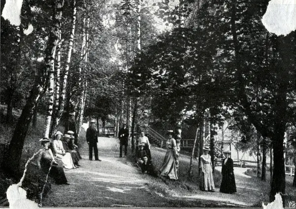 Pasienter i parken. Fra et hefte "Grefsen sanatorium for tuberkuløse". Bildet er sannsynligvis klippet ut fra en informasjons- eller reklamepublikasjon for sanatoriet.