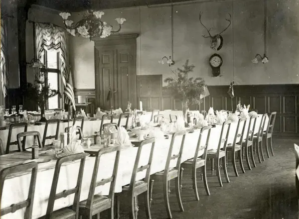 Fra spisesalen. Pent dekkete bord. Dublett av A-10021/U/001/065. Fra et hefte "Grefsen sanatorium for tuberkuløse". Bildet er sannsynligvis klippet ut fra en informasjons- eller reklamepublikasjon for sanatoriet.