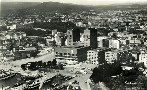 Oslo Rådhus. Rådhusplassen med bussterminal og vannspeil. Rådhusbryggene med Honnørbrygga og utstikkere. Havnemiljø. Del av gamle Vika til venstre. Postkort med nr. 346. Flyfoto.