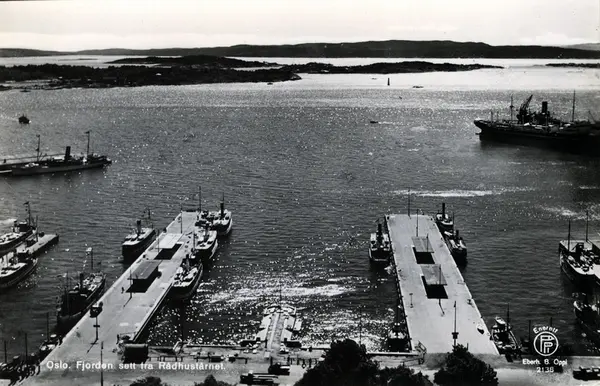 Pipervika. Rådhusbryggene med Honnørbrygga og Utstikker 2 og 3. Havnemiljø med båter. Hovedøya og Lindøya nørmest av øyene i bakgrunnen. Postkort med nr. 2138.