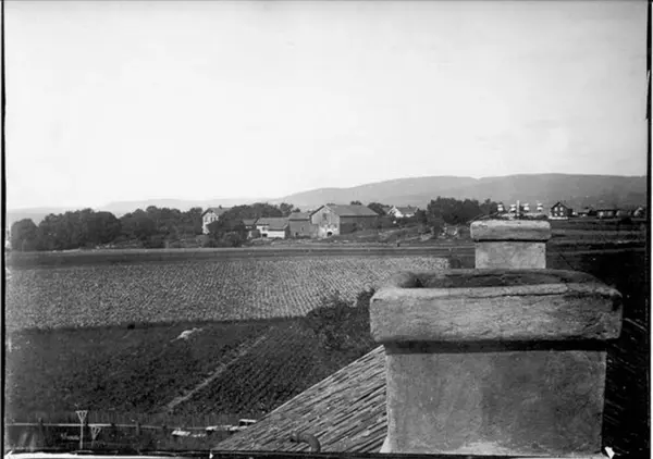 Fotografert mot vest fra taket på Østre Hasle gård i Økernveien. Frydenberg til venstre, Vestre Hasle til høyre. Det mørke huset ytterst til høyre for pipa kan være Renflot under Hasle, gnr. 126/46, med nåværende adresse Seljeveien 4. Mer detaljert informasjon om motivet finnes.
