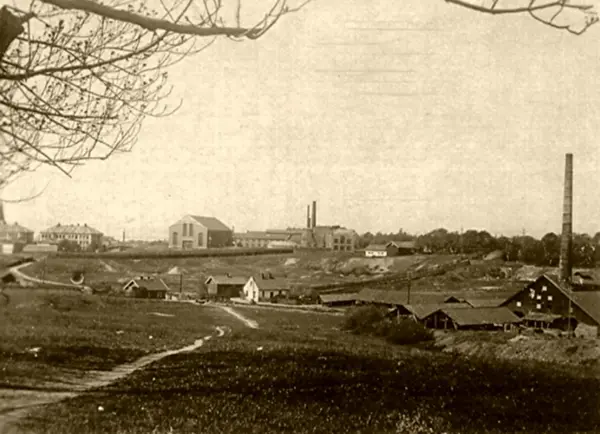 Utsikt fra Grønvold, med plassen Lilleberg i midten, ved nåværende Gladengveien, i krysset ved Ensjøveien (tidigere trasé). Grønvold (Lenschow) teglverk til høyre. Kampen skole i bakgrunnen til venstre. Industribygninger (?) i midten.