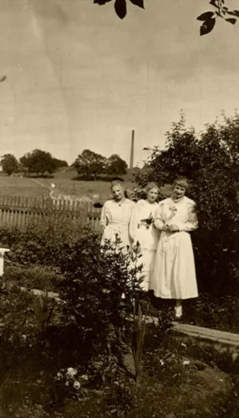 Fra plassen Lilleberg, ved nåværende Gladengveien, i krysset ved Ensjøveien (tidigere trasé). Søstrene Nielsen (barn av teglverksformann Svend Nielsen, Grønvold (Lenschow) teglverk). Pipa på Grønvold i bakgrunnen.