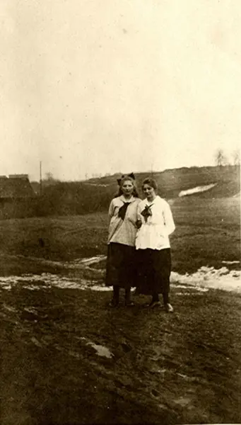 Fra plassen Lilleberg, ved nåværende Gladengveien, i krysset ved Ensjøveien (tidigere trasé). Søstrene Nielsen, barn av teglverksformann Svend Nielsen, Grønvold (Lenschow) teglverk.
