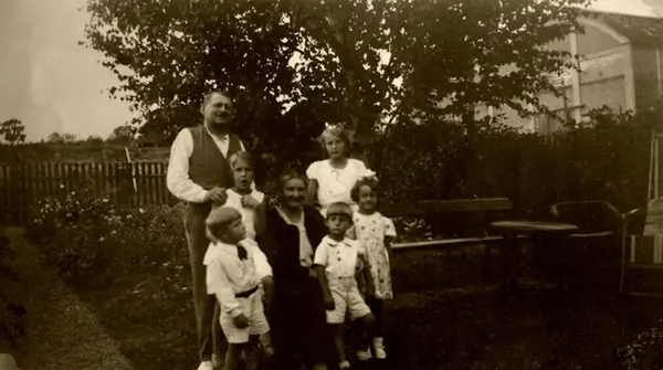Fra plassen Lilleberg, ved nåværende Gladengveien, i krysset ved Ensjøveien (tidigere trasé). Teglverksformann Svend Nielsen, Grønvold (Lenschow) teglverk, og hustru Anna med barnebarn. Stålverkshllene til Christiania Stålverk i bakgrunnen.