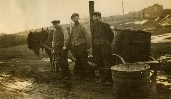 Teglverksarbeidere (kjørekarer) ved Lilleberg (Lenschow) teglverk). Grønvold i bakgrunnen. Ved nåværende Gladengveien, i krysset ved Ensjøveien (tidigere trasé).