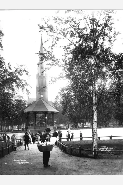 Gateselger med kurv. Den gamle musikkpaviljongen. Parken sett mot vest, anlagt av rittmester Thorvald Meyer i 1860-årene, Paulus kirke i bakgrunn, barn i parken.