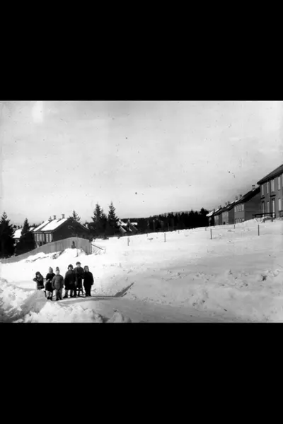 Holtet hageby, 1930-tallet. Fra Erlandstuveien, i krysset med Einerveien. Bebyggelsen til høyre er Høgdefaret og den til venstre er Erlandstuveien. Vinter, med en gruppe barn med spark på veien