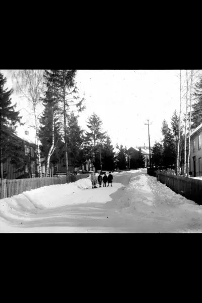 Fra Erlandstuveien, i krysset med Samvirkeveien og Smedstusvingen. Huset til høyre er Erlandstuveien 3. Holtet hageby, vinter, med en gruppe barn på veien