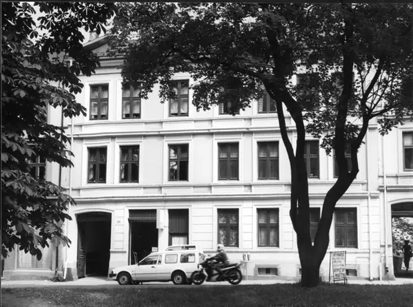 Rehabilitert bygård. Helgesens gate 46, bygård / leiegård etter opp-pussing av fasade. Fortausplakat for skorepasasjons- og renseri-virksomhet. Mann på motorsykkel. Parktrær i Sofienbergparken.