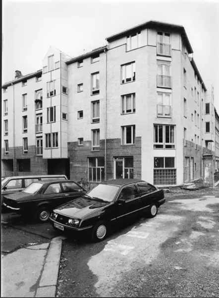 Nyoppført bygård / leiegård for USBL, hjørnet Friis' gate 6 mot Heimdalsgata (nærmest). (Originaltittel er misvisende, Heimdalsgata 34 er utenfor bildet.)