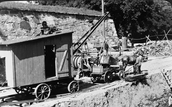 Utgravning for legging av hovedkloakk (betongrør) i nedre Kongens gate ved Østre festningsmur. Løftekran på trallevogn. Hest og kjerre. Fra begynnelsen av 1930-tallet.