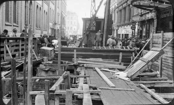 Folk bivåner arbeidet med fellestunnelen / kloakkledningen utenfor daværende Admiral-Palads kino (nåværende Eldorado kono, tidl. Verdensspeilet) i Torggata. Tobakks- og juvelerforretning. Butikkreklameskilt.