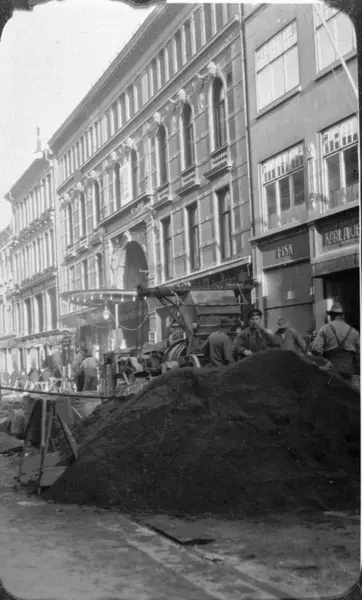 Arbeide med kum til fellestunnelen / kloakkledningen ved Admiral-Palads kino (nåværende Eldorado kino, tidl. Verdensspeilet) i Torggata. Sementblander. Jordmasse til gjenfylling.