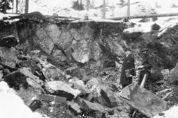 Sprengningsfelt i forbindelse med bygging av vannreservoar i Holmenkollåsen. En leder i vannvesenet på inspeksjon. Trillebår. Redskaper. Albumtittel: "Akers Vand- og Kloakvæsen Fotografier af Anlæg"