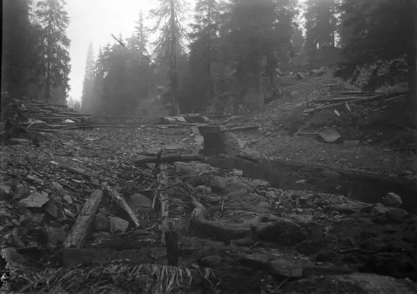 Steinsatt utløp under dammen (skjæring) ved Grimstjernet / Grimsvatnet.
