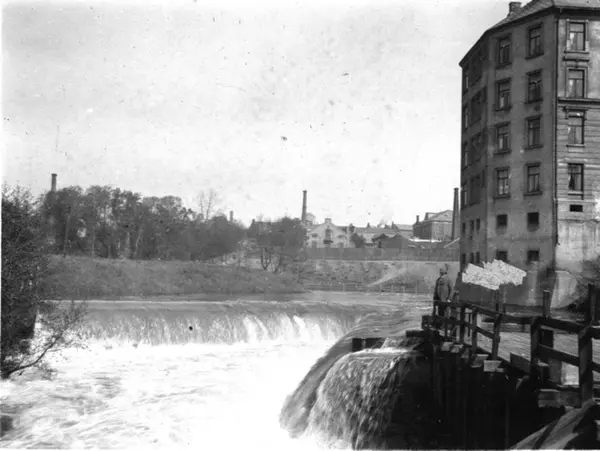 Flom eller slipping av vannet i Akerselva. Kuba sees rett ovenfor fossen på venstre siden av elven i billedflaten. Gård i Marselis' gate (revet) i forgrunnen.