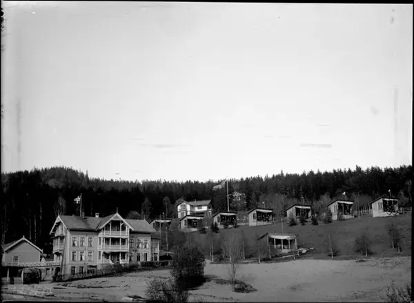 Sanatoriebygningene med den gamle hovedbygningen fra Vandcuranstaltens tid. I bakgrunnen "solkassene" der pasientene tilbrakte mye tid når været tillot det.