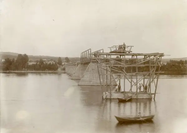 Bygging av steinpillarer i elva. Trestillaser, robåter. "Fra Broanlegget ved Sander. Sommeren 1896. Stillads for Muring af den søndre Pillar. Den ferdighugne Sten transporteredes fra nordre Elvekant med hjælp af den for haandenværende store Pram, der forhaledes langs det paa Billedet synlige Taug." (påskrift på baksiden av fotoet) Fra boks med påskriften "Fundamentering".
