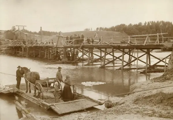 Konstruksjon av trebro. Stillaser. Ferge eller pram som frakter hest, kjerre og folk over elva. Trekkes med tau. Fra boks med påskriften "Fundamentering".
