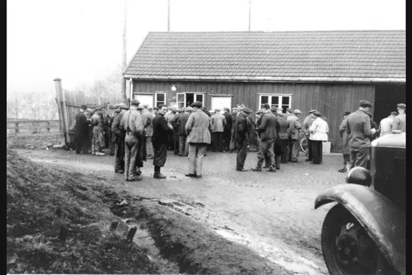 Arbeidsfolk i kø utenfor lønningskontor på Munkehagen.Kilde: "Ved renhold og orden skabes sundhed og liv. RAF 100 år 1895-1995" (Hegna, T. Messel, J. (1995))
