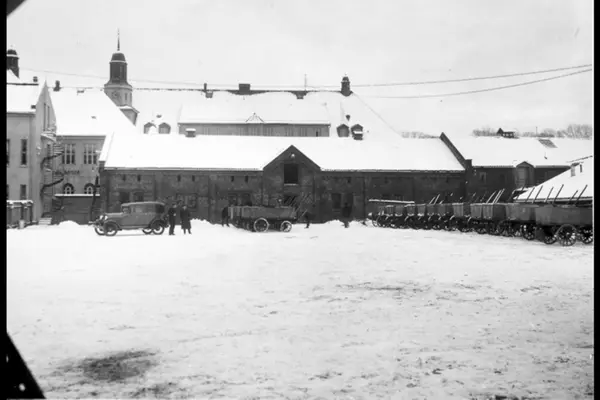 Christiania Pudrettfabrikk, driftsbygning for Renholdsverket fra 1912. Pudrettvogner.Kilde: "Ved renhold og orden skabes sundhed og liv. RAF 100 år" (Hegna, T og Messel, J (1995))