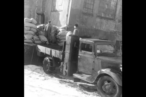 To mannlige arbeidere som lemper sekker på lastebil. Ford V8 1936 lastebil med vedgassgenerator (mellom førerhus og platt). Datering derfor sannsynligvis 1940/41-45.
