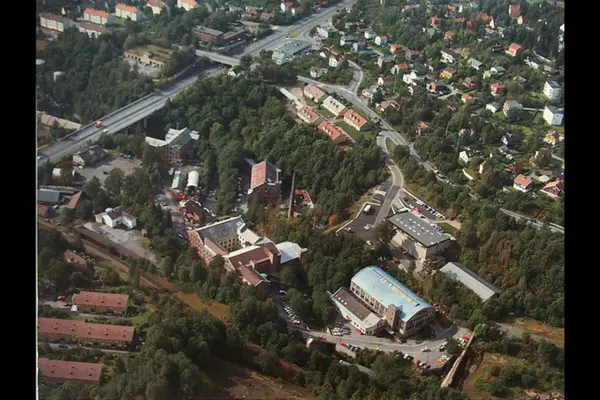 Flyfoto over Nydalen Compagnies fabrikkområde. Antakelig fra slutten av 70-årene. Ringveien til venstre og Gjøvikbanen foran. Rolf Wickstrøms vei, Nydalsbrua, Maridalsveien, Gjerdrums vei.