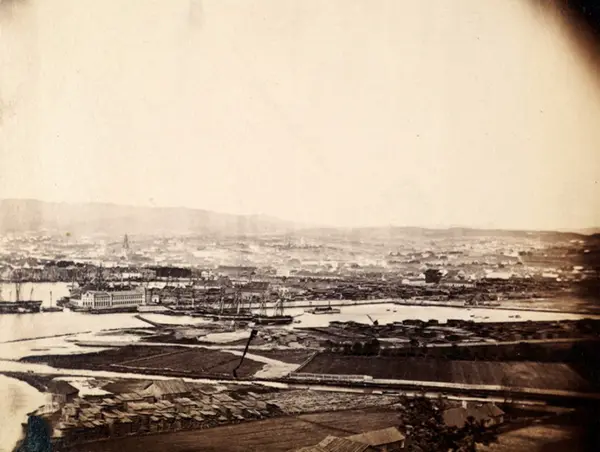 Dette er en fortsettelse av forrige bilde (A-10408/U/0001/003) rundt den indre del av Bispevika. Legg merke til at ingen stører båter kan gå så langt inn. Den store bygningen til venstre er Nylands verksted. Vår Frelsers kirke skimtes lenger bak. Den lange lave bygningen innenfor kan kanskje ha noe med Grønland å gjøre? I forgrunnen passerer Loelva (Alna), og hitenfor den ser vi også noen trelasttomter.