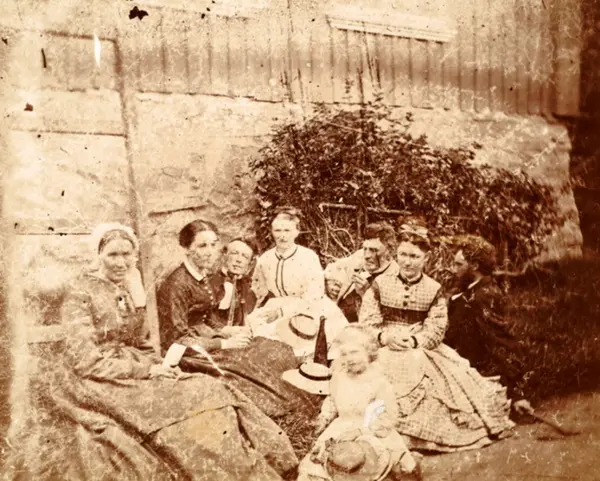 Fortsatt feiring, jf. A-10408/U/0001/015. Fra venstre: Ukjent kvinne, ukjent kvinne, ukjent herre, fru Gleny Falck Ytter, ukjent herre, fru Alette Bjerknes (født Koren 1837), datter av sogneprest Koren til Selje, C. A. Bjerknes (født 1825), senere professor. Foran: Dorothea Falck Ytter, 3 år