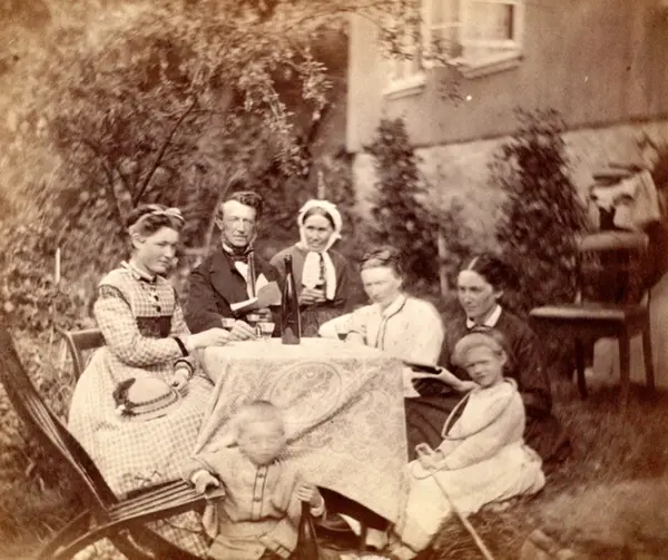 Fortsatt feiring, jf. A-10408/U/0001/015. Fra venstre: Fru Alette Bjerknes (født Koren 1837), datter av sogneprest Koren til Selje, ukjent herre med langpipe, ukjent kvinne, fru Gleny Falck Ytter, ukjent kvinne, Dorothea Falck Ytter, 3 år. Foran: Nils Falck Ytter, 1 år