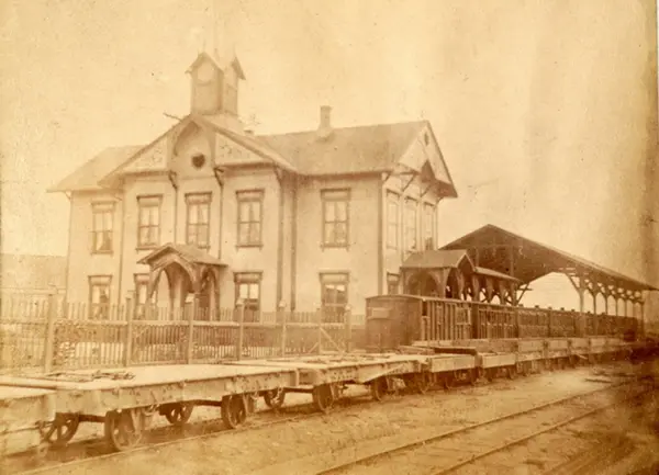 Hamar første stasjonbygning, oppført til åpningen av Hamar-Grundsetbanen i 1862. Bygningen ble imidlertid ikke panelt før i 1866, så bildet kan tidligst være fra da. I 1880 ble den erstattet av en ny bygning. Jernbanespor, godsvogner, stasjonsbygning, pakkhus.