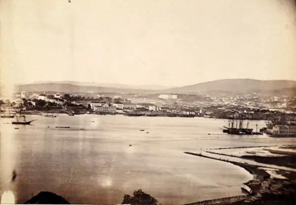 Utsikt over havna, med seilskuter. Den borteste vika er Bjørvika, den midtre er Bispevika og den nærmeste må være Grønlia. Like hitenfor skuta kommer Akerselva ut, og ved den lange odden nærmest ser vi utløpet av Loelva (Alna). I bakgrunnen midt på bildet ser vi Slottet, og helt til venstre ligger Akershus. Kan de store bygningene i forgrunnen være forsvarets bygg ved festningsplassen (i dag bl.a. forsvarsmuséet?) Lenger til høyre Paléet med store trær foran? Bakenfor skuta: Tollboden? De store bygningene til høyre for skuta må være Nylands Verksted, og hitenfor Nyland kommer Akerselven ut. Den lyse stripe nedover mot høyre bak det innerste av Bjørvika er kanskje Grønland? Innerst i Bjørvika ligger de bekjente bordtomtene. Den lange odden nærmest til høyre styrer Loelvas utløp.
