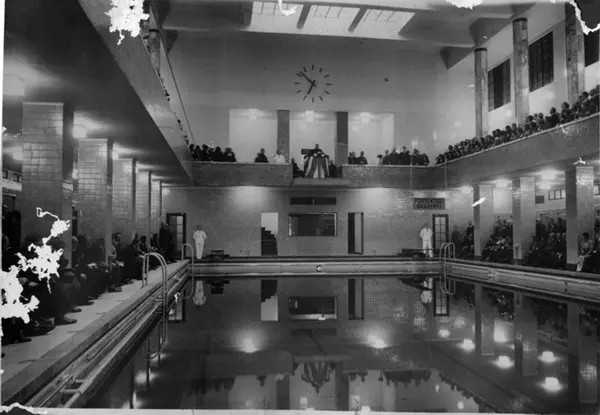 Storslått åpning av svømmehallen i det nyeTorggata bad med kommunestyre, badeutvalget, betjening og gjester. Badet var det første med 25 m basseng og hadde blant annet romerbad, dusj og egne avdelinger for karbad. Talestol på fem-meteren. De to tremeters stupebrettene var ennå ikke montert. Svømmehallen ble tatt i bruk 1. desember 1931 og hermed var hele anlegget i drift.