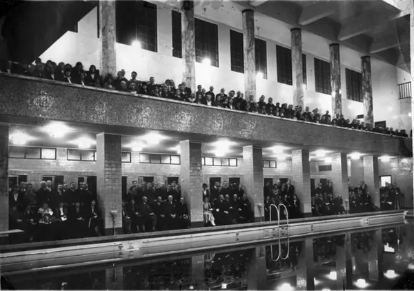 Innviterte gjester under åpningsseremonien av svømmehallen i det nye Torggata bad. Sittende og stående langs bassenget i svømmehallen og oppe langs galleriet i andre etasje. Marmorsøyler. Galleriet dekorert med fargede moaikkfliser. Fargede fliser i Svømmehall. Svømmehallen tatt i bruk 1. desember 1931.