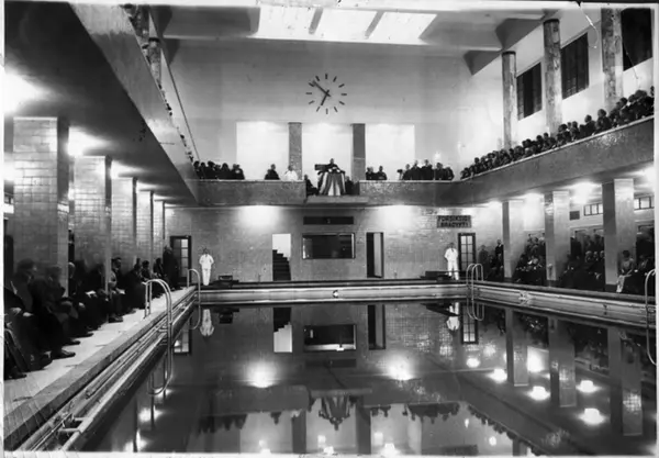 Åpningstale for svømmehallen i Torggata bad. Svømmehallen ble tatt i bruk første desember 1931. Grunnsteinen ble lagt første september 1924. Badet ble bygget i tre etapper hvorav første etappe besto av fløyen mot Badstugata, andre etappe var hovedfasaden og fløyen mot Vaskeribakken (Hammersborggata). Tredje etappe besto av svømmehallen med tilliggende rom. Under talestolen på femmeteren ses kontrollrommet for svømmehallen.