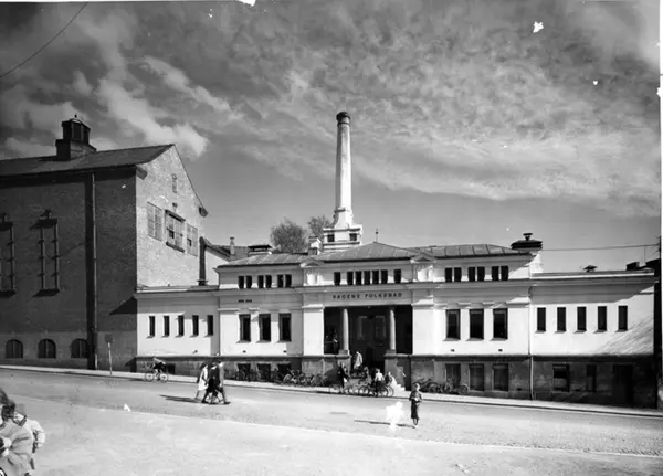 Sagene bad. Folkebadets søyleinngang til billettsalget.Kvinneavdelingen fløyen til høyre med tjenestebolig i underetasjen. Herreavdelingen til venstre. Tilstøtende bygning er svømmehallen og Sagene skoles gymsal i andre etasje (1924-26).
