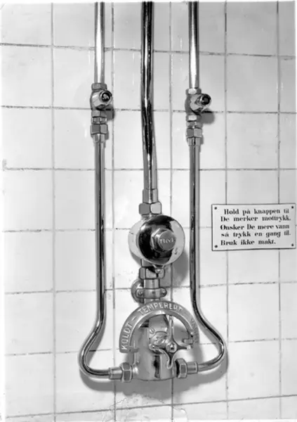 Torggata bad. Blandingsbatteri for dusj. Skiltet med: Hold på knappen til De merker mottrykk. Ønsker De mere vann så trykk en gang til. Bruk ikke makt. Dusjavdelingen.