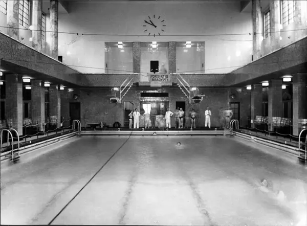 Torggata bad. Svømmehallen med stupebretter 1, 3 og 5 meter. Basseng 25 x 12,5 m. Badende skoleklasse med lærer og tre badevakter i sine hvite uniformer.