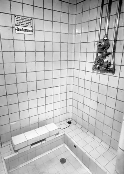Torggata bad. Dusjavdelingen etter Tysk mønster. Enkeltdusjbad med nedfelt fotvaskom og sittebenk. Blandingsbatteri til dusj. Skiltet med: Hold på knappen til De merker mottrykk. Ønsker De mere vann så trykk en gang til og tøm kummen.