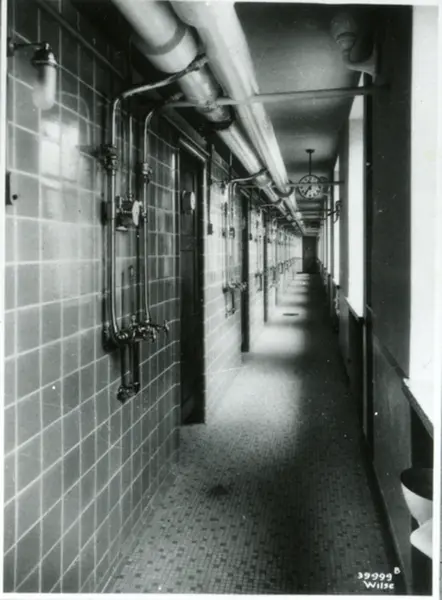 Torggata bad. Fotgangen med dører til hvert enkelt dusjbadrom. Dørklokke for vasling av badetid. Dusjbadavdelingen lå i kjelleren sammen med fyrrom og øvrige maskinrom.