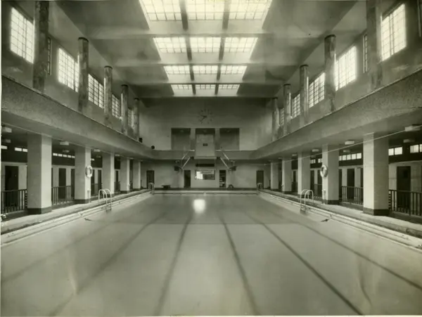 Torggata bad. Svømmehallen, i hovedfasaden av bygget, med bassenget, Skiftekabiner på begge sider, Supebrett/tårn og kontrollrommet i enden av bassenget, med trapp opp til galleriet med sine søyler.