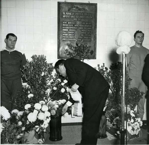 Torggata bad. Avdukning av minneplate i bronsje med tekst sitat: Til minne om svømmere fra Oslo som ofret livet for landet i krigen 1940-1945. Seksten navn. To svømmere som æresvakt. Platen hang oppe på galleriet bak femmeteren. Flyttet til Tøyenbadet etter nedleggelsen av badet.
