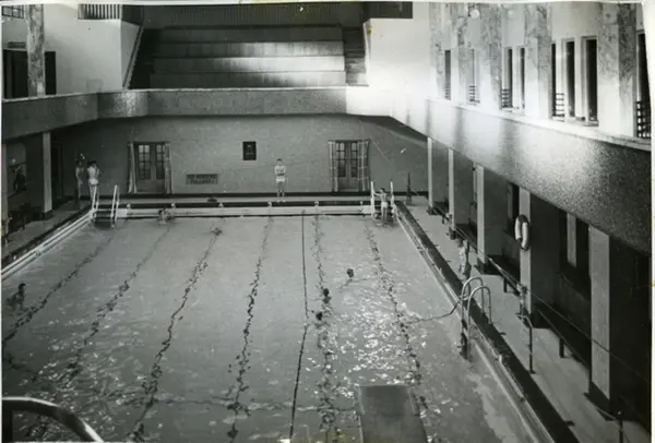 Torggata bad. Svømmehallen med badende gutter. Dører inn til dusjrommene for svømmehallen. På veggen et bronserelieff av Thv. Meyer. Avslørtes 8.juni 1933 med bla. H.M.Kongen og bystyrets medlemmer. Galleriet med tilskuerplasser i enden. Bildet tatt på galleriet ved femmeteren.