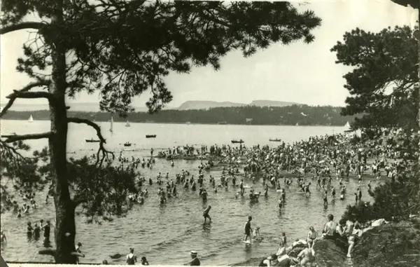 Yrende badeliv i Paradisbukta. Seil og robåter på Lysakerfjorden som ligger på vestsiden av Bygdøy. I bakgrunnen ses Bærums Landet med Kolsåstoppen. Påskrift bak på bildet: Paradisbukta. Stemplet Oslo Kommune, driftbestyreren for badene. Albumtittel Paradisbukten.